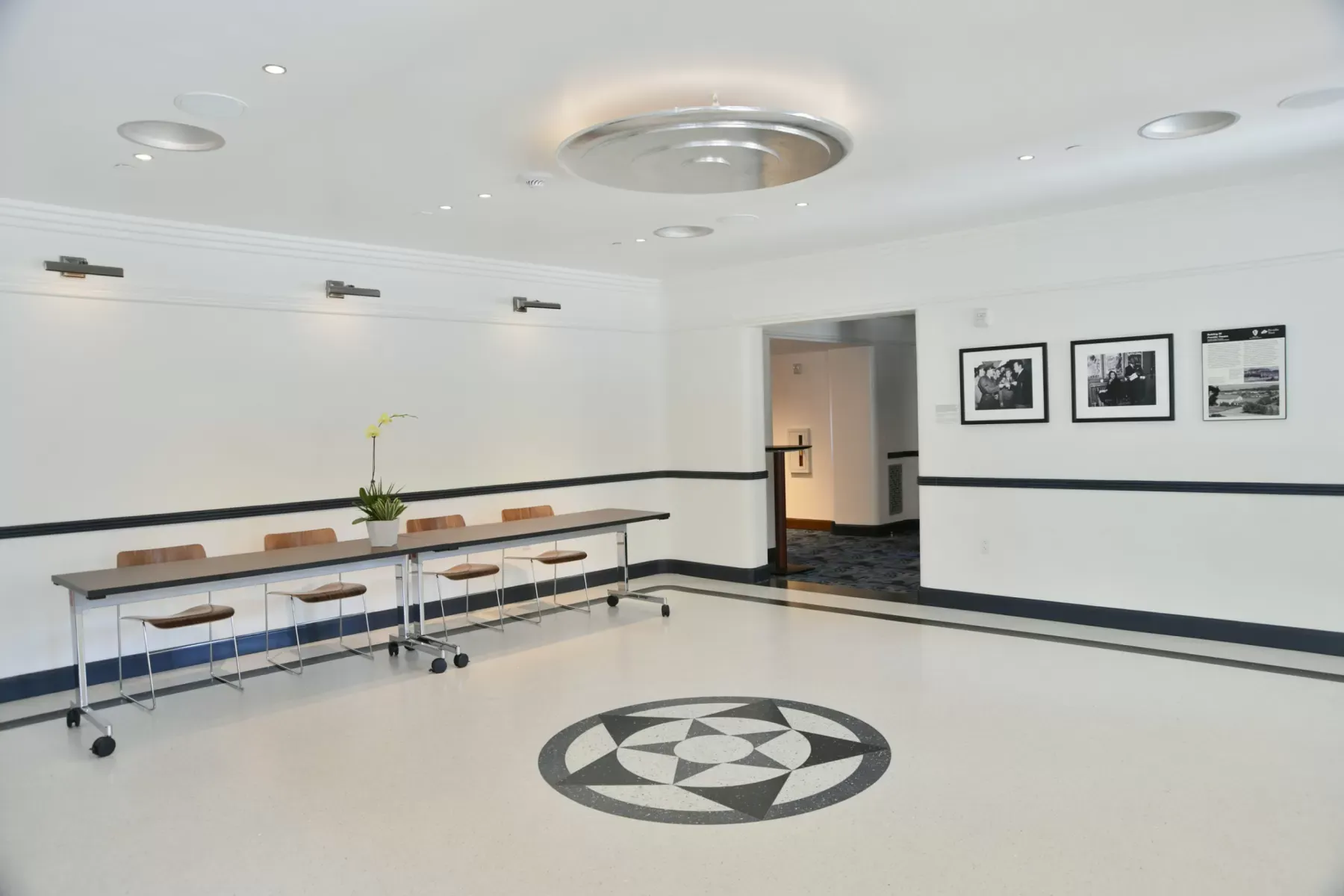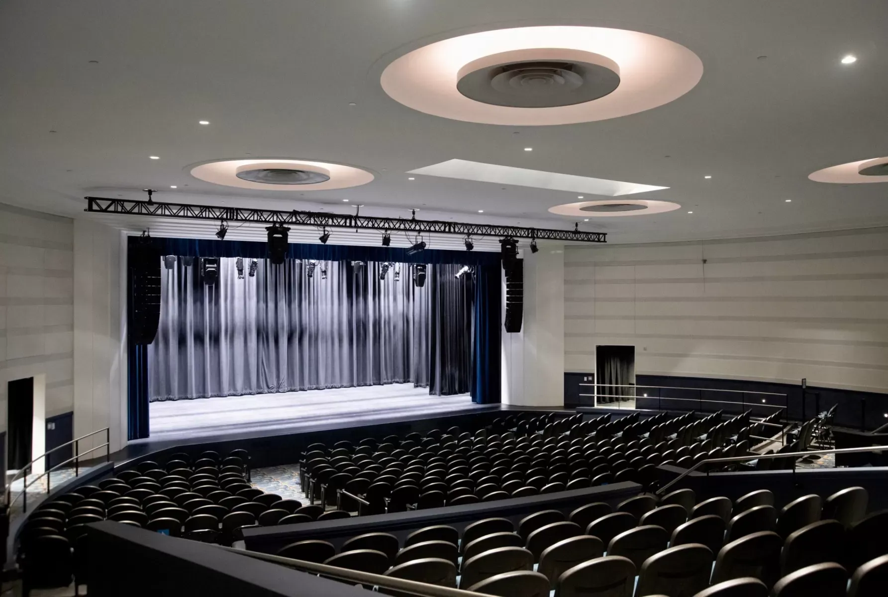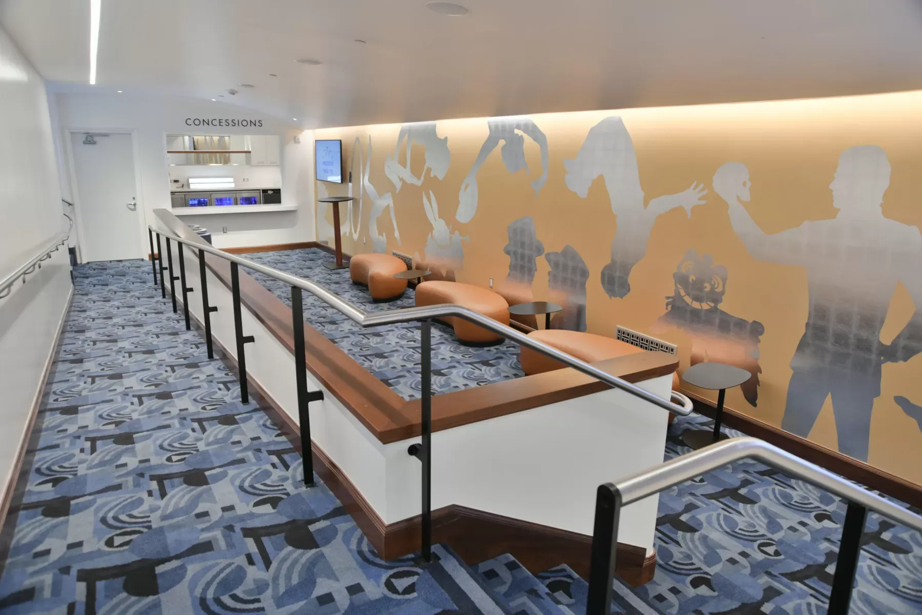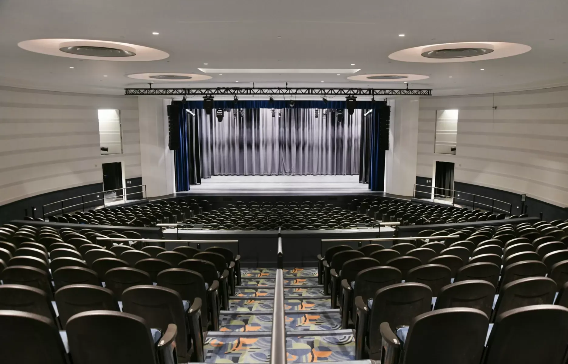 Main level includes a 612-seat auditorium, lobby, lounge with concessions bar, coat check, and box office. Lower level includes a second lobby with concessions bar and restrooms. All ADA accessible.
